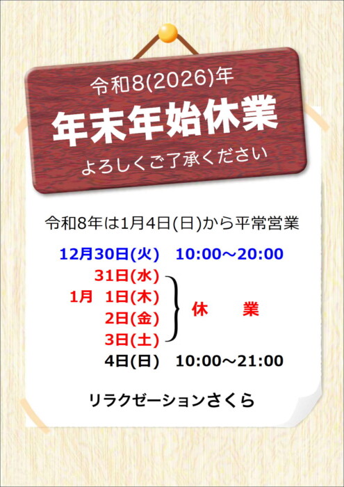 例年どおり12月31日(水)~1月3日(土)は年末年始休業とさせていただきます。